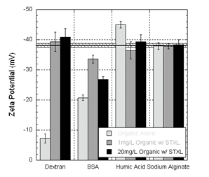 Figure 2: Zeta potential measurements of solutions containing the model organic, 1mg/L organic with silica colloids, and 20mg/L organic with silica colloids. Zeta potential (with standard error) of silica colloids alone is marked by the black bar. BSA is the only organic that interacts with the silica colloid solution to change the surface chemistry, indicating that BSA can contribute to combined fouling mechanisms directly. |
