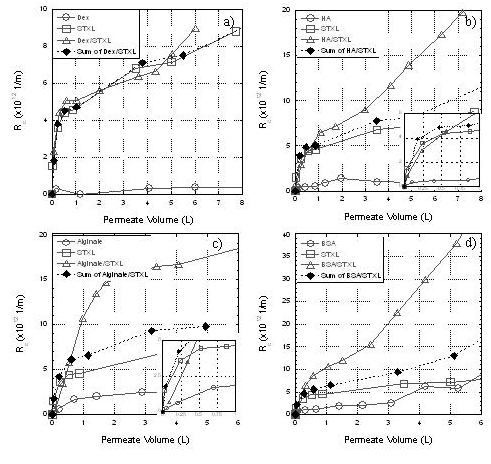 Figure 3: Cake layer resistances formed during single and combined fouling experiments with silica and a) Dextran (Dex), b) humic acid (HA), c) sodium alginate, and, d) bovine serum albumin (BSA). Combined resistances are compared to the calculated sum of the individual components in order to reveal combined fouling mechanisms, which are present in the HA, alginate and BSA experiments. The three hypothesized mechanisms: increased resistance of the mixed fouling layer, hindered back diffusion, and organic foulant adsorption were shown to have varying effects on combined fouling, depending on the specific organic foulant. The greatest synergism was observed in the presence of an interacting organic foulant, BSA, which can adsorb on silica colloids as well as the membrane surface to reduce repulsive interaction between foulants and the membrane as well as that among foulants.